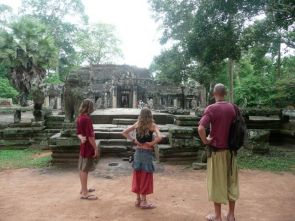 Sur la route qui nous conduit à la capitale Phnom Penh, nous nous arrêtons un jour à Kompong Chhnnang pour y visiter les villages flottants. C’est l’occasion de découvrir une communauté vietnamienne et un mode de vie plutôt unique. Sur des embarcations diverses sont construites des maisons de bois, dont les styles et l’aménagement varient considérablement. De la baraque la plus sommaire avec pour seul équipement un hamac pendu sur la terrasse à la véritable petite villa, nous découvrons au fil de l’eau un village où la vie se déroule au rythme lent et paisible de la rivière. Très vite notre sentiment de gêner ou de violer une intimité mal protégée par la précarité des habitations est dissipé par les bonjours, sourires et autres signes de la main qui accueillent notre pirogue à chaque nouveau canal. Nous sommes touchés par tant de simplicité et de sollicitude de la part de cette population. Puisque nous n’irons pas au Vietnam, en raison de l’impossibilité d’y importer notre véhicule, cette escapade nous aura permis de nous faire une petite idée de la gentillesse des vietnamiens. Et puis, nous aurons aussi eu le plaisir d’apprécier le look de certaines femmes, dont les vêtements non assortis et aux couleurs fluorescentes n’ont pas fini de faire parler Loane et Véro...