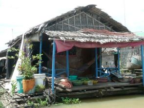 Sur la route qui nous conduit à la capitale Phnom Penh, nous nous arrêtons un jour à Kompong Chhnnang pour y visiter les villages flottants. C’est l’occasion de découvrir une communauté vietnamienne et un mode de vie plutôt unique. Sur des embarcations diverses sont construites des maisons de bois, dont les styles et l’aménagement varient considérablement. De la baraque la plus sommaire avec pour seul équipement un hamac pendu sur la terrasse à la véritable petite villa, nous découvrons au fil de l’eau un village où la vie se déroule au rythme lent et paisible de la rivière. Très vite notre sentiment de gêner ou de violer une intimité mal protégée par la précarité des habitations est dissipé par les bonjours, sourires et autres signes de la main qui accueillent notre pirogue à chaque nouveau canal. Nous sommes touchés par tant de simplicité et de sollicitude de la part de cette population. Puisque nous n’irons pas au Vietnam, en raison de l’impossibilité d’y importer notre véhicule, cette escapade nous aura permis de nous faire une petite idée de la gentillesse des vietnamiens. Et puis, nous aurons aussi eu le plaisir d’apprécier le look de certaines femmes, dont les vêtements non assortis et aux couleurs fluorescentes n’ont pas fini de faire parler Loane et Véro...
