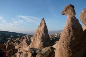 On se réjouissait d’y aller. On l’attendait avec impatience…. Aujourd’hui, on sait pourquoi ! C’est tout simplement phénoménal ! Au mois de décembre, sans personne sur les sites, sans queue dans les églises et avec une lumière chaude et douce du matin au soir pratiquement, la Capadocce est un vrai régal. Le spectacle est hallucinant. Que l’on parle des cheminées de fées, des églises rupestres et leurs peintures ou des villes souterraines, c’est clair, la Capadocce est un miracle de notre planète. Le sol de cette région – le tuf – est un mélange de cendres et de boues rejetées par les volcans alentours. Suite à l’érosion importante de ce sol très friable, la région s’est déchiquetée ou a ondulé par endroits. De la roche plus dure protège certains cônes et leur donne cette forme particulière, comme couverts d’un chapeau.